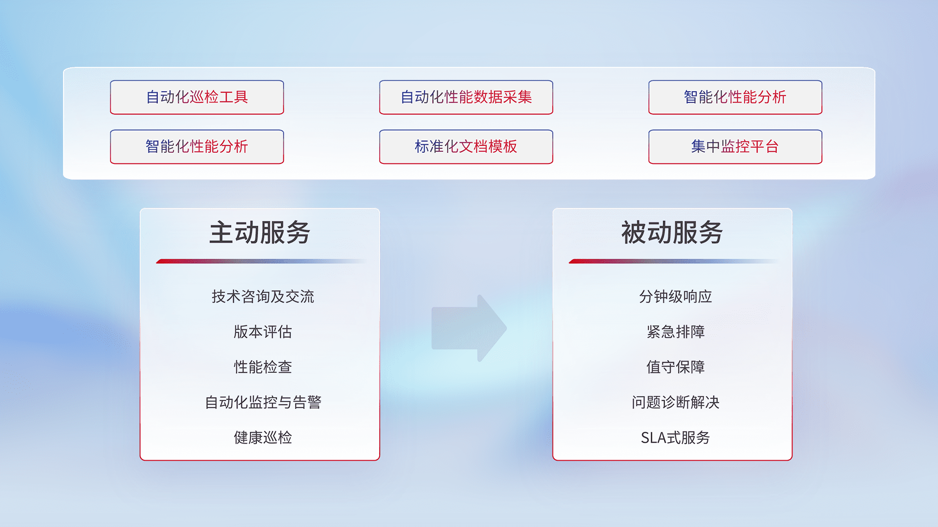 智能化工具和标准化文档,,保障服务质量,,,,提供主动服务(包含技术咨询、、、、版本评估、、性能检查、、、、自动化监控与告警、、、、健康巡检)和被动服务包含(分钟级响应、、、、紧急排障、、、值守保障、、问题诊断解决、、、SLA服务)。。
