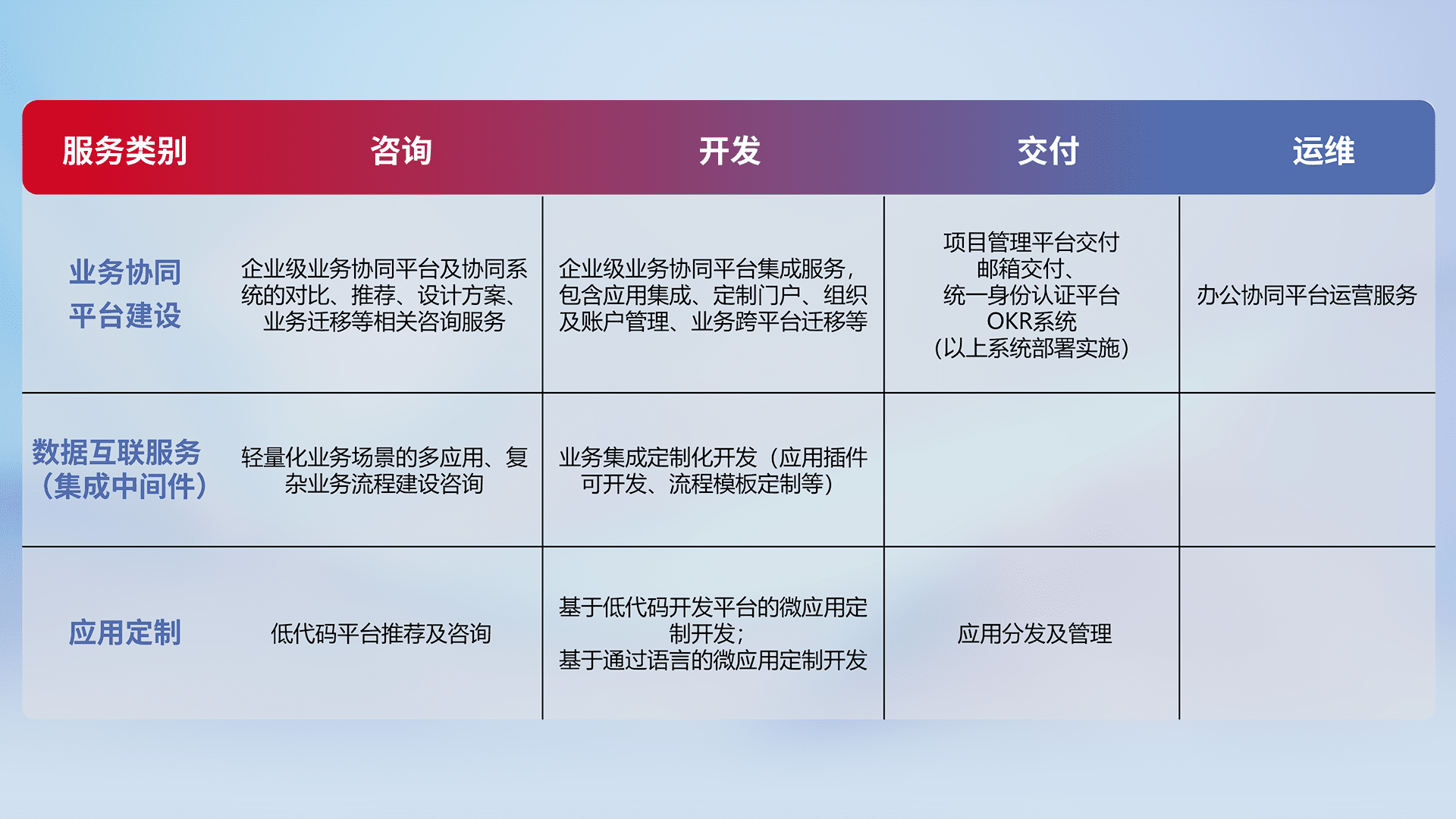 针对钉钉、、企微、、、、IDaas等平台级产品提供产品的规划、、方案、、交付、、、、定制化开发等服务,,,,实现如统一协同办公、、、智能客户服务、、、混合会议管理、、、、智能数据查询、、等业务场景,,,实现数字化转型。。